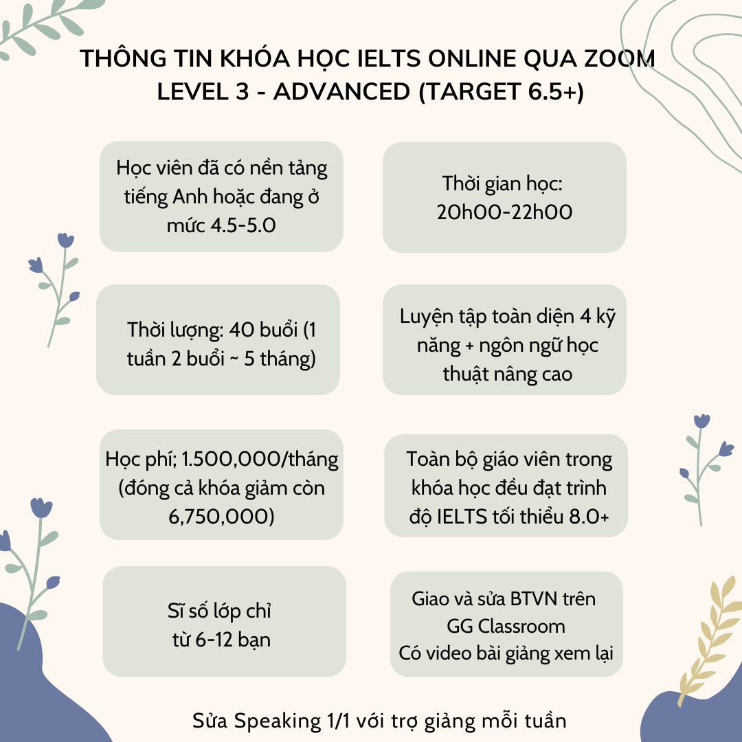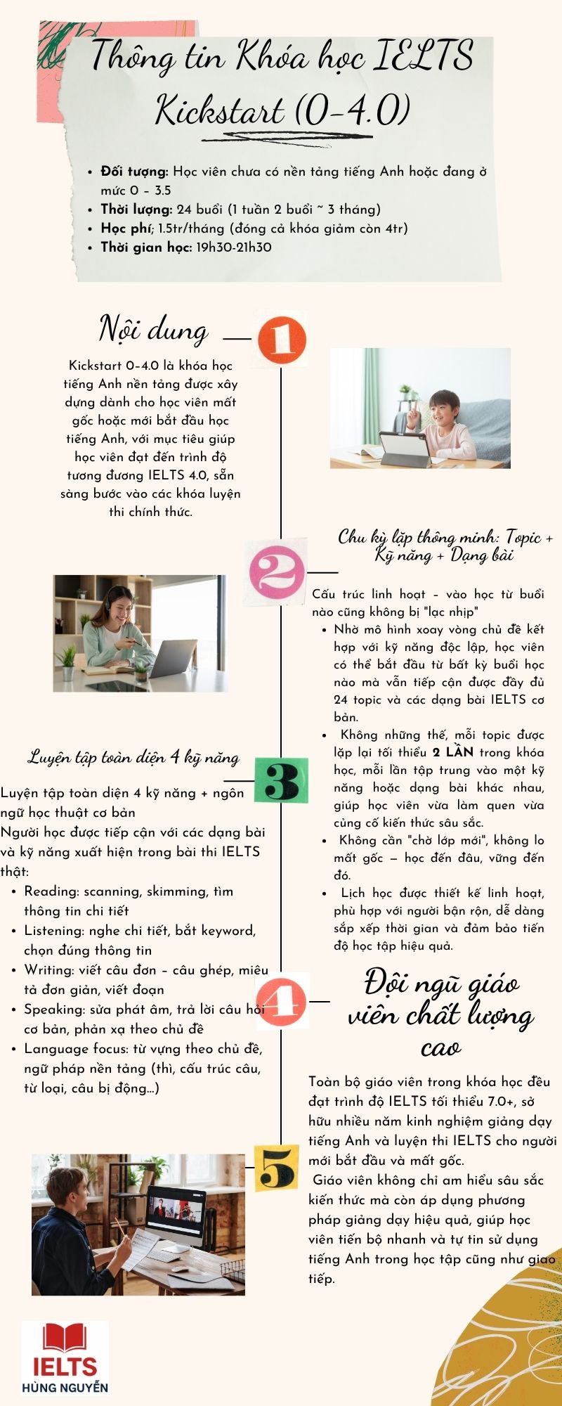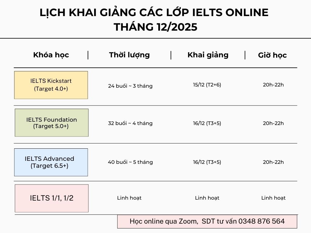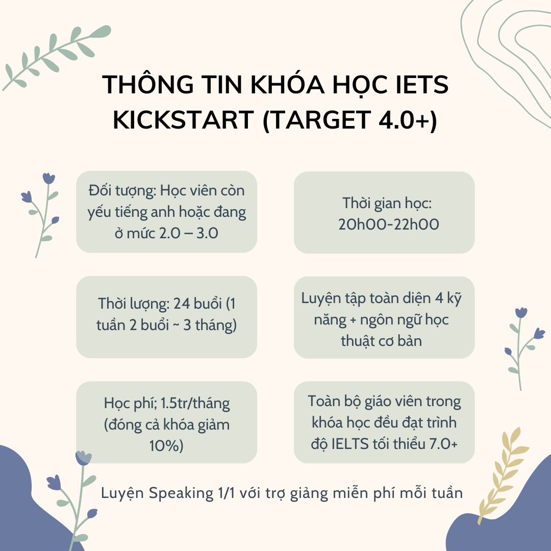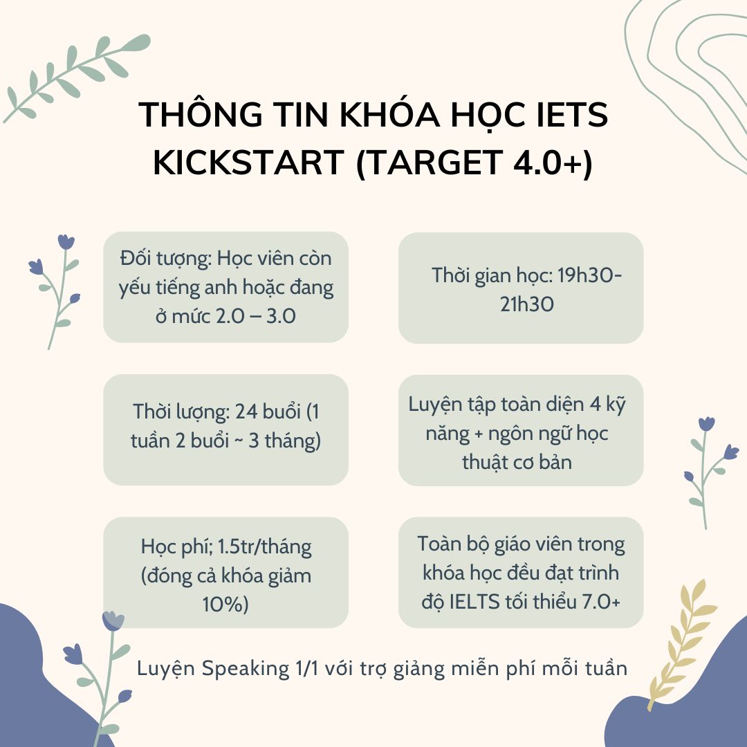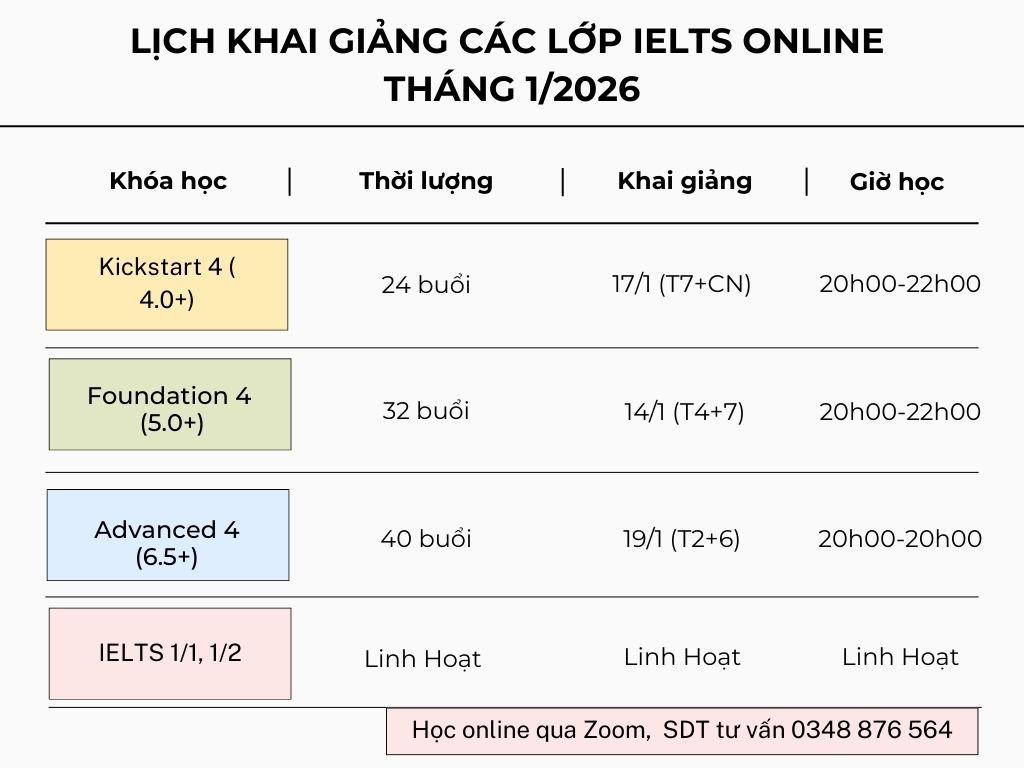 Lộ trình học tham khảo: IELTS KICKSTART (Target 4.0+) (24 buổi), IELTS FOUNDATION (Target 5.0+) (32 BUỔI), IELTS ADVANCED (Target 6.5+) (48 buổi)