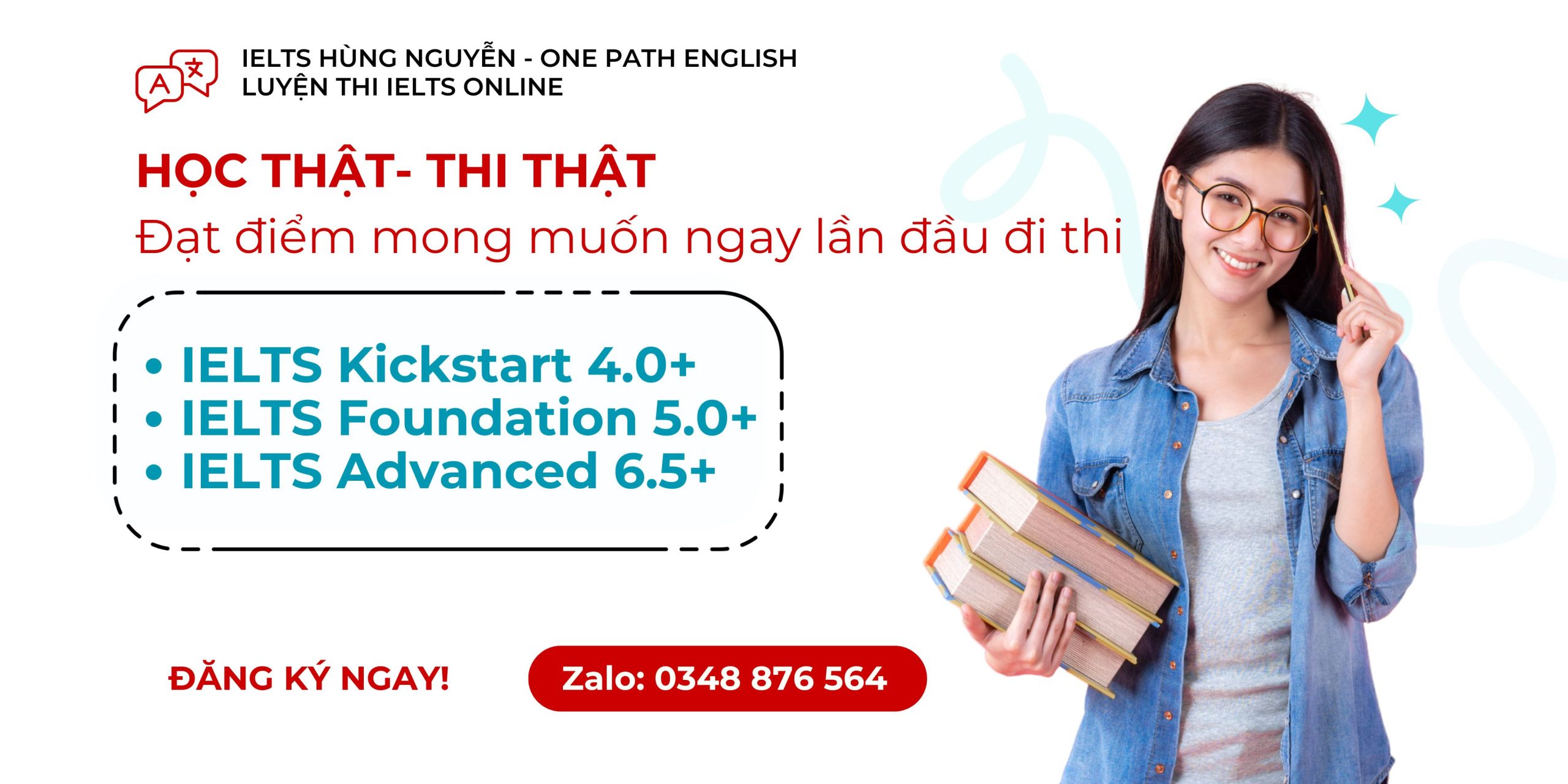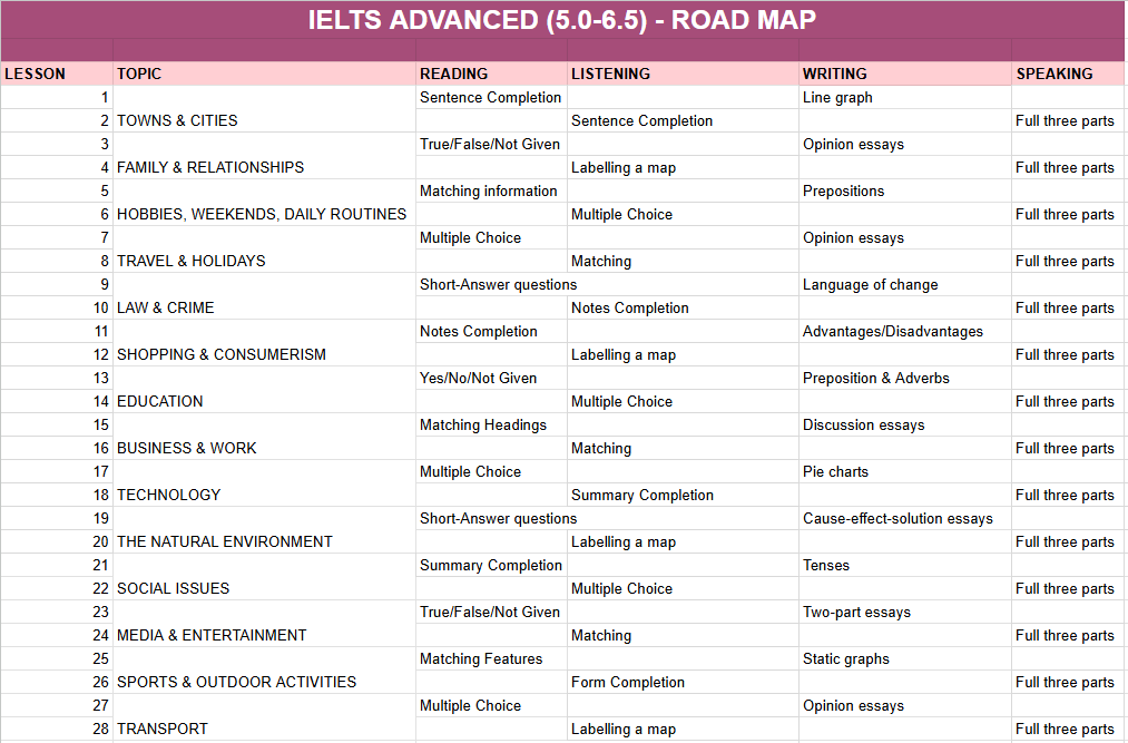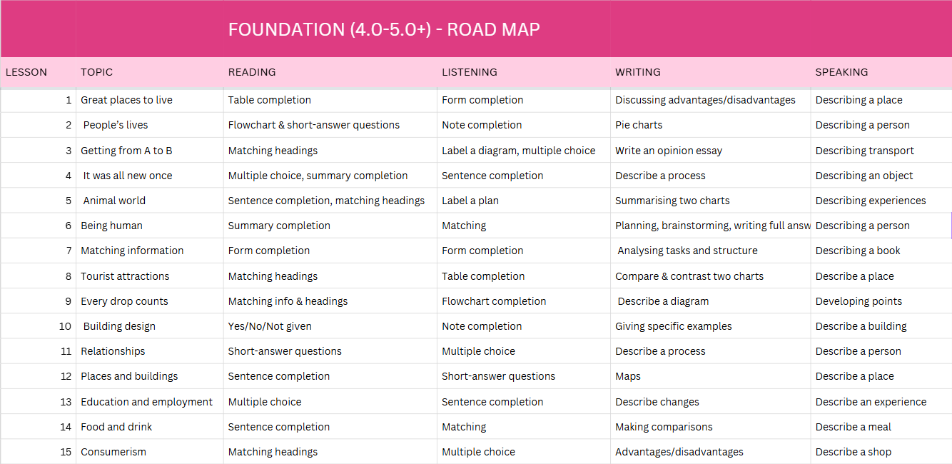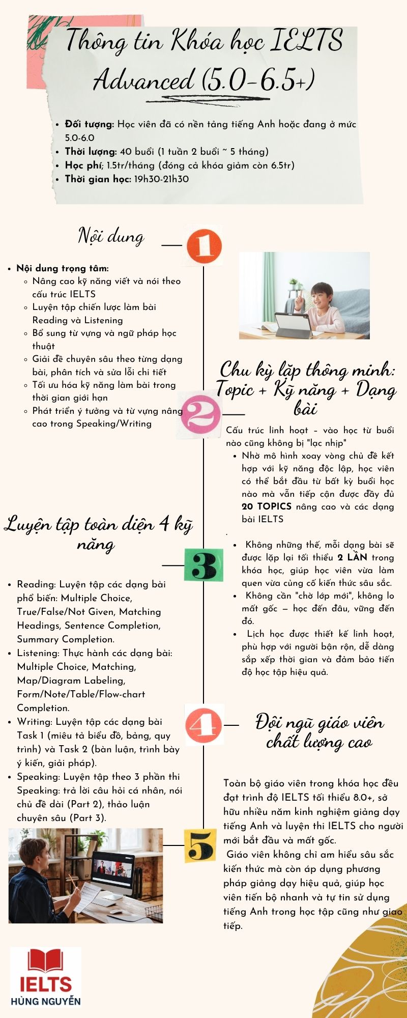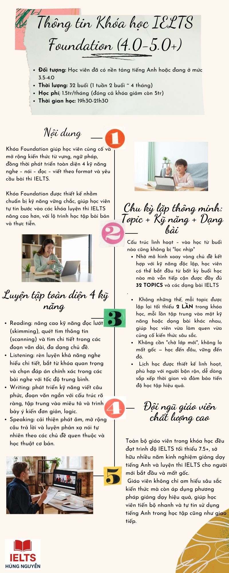 Lộ trình học tham khảo: IELTS KICKSTART (Target 4.0+) (24 buổi), IELTS FOUNDATION (Target 5.0+) (32 BUỔI), IELTS ADVANCED (Target 6.5+) (48 buổi)