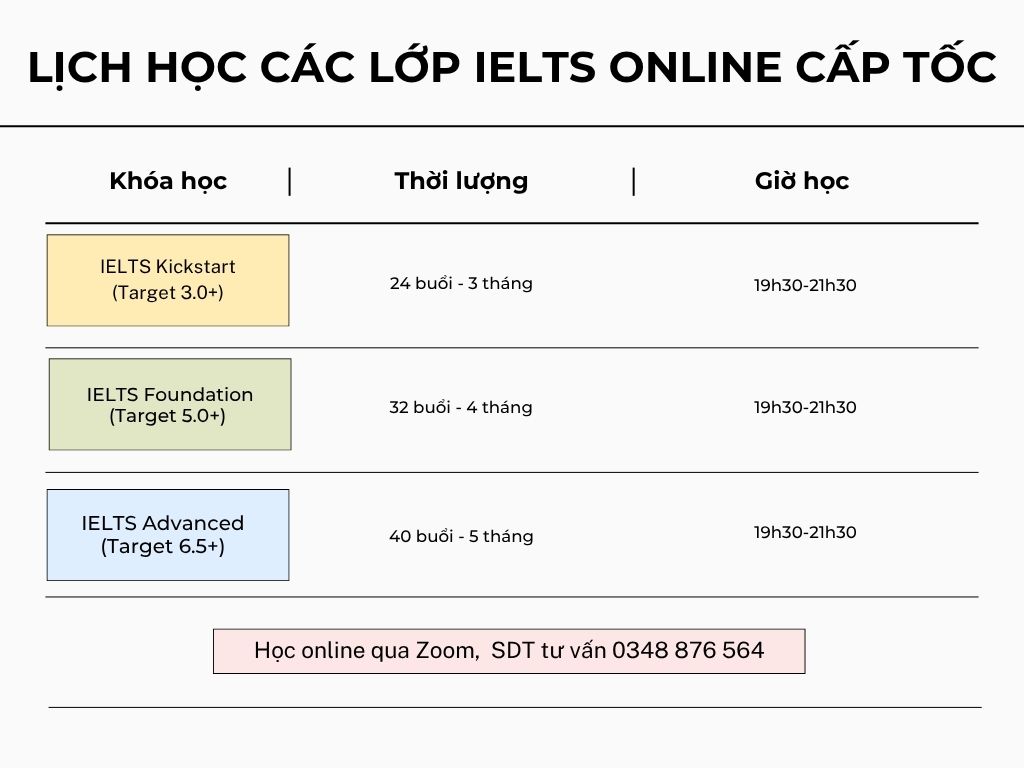 Lộ trình học tham khảo: IELTS KICKSTART (Target 4.0+) (24 buổi), IELTS FOUNDATION (Target 5.0+) (32 BUỔI), IELTS ADVANCED (Target 6.5+) (48 buổi)